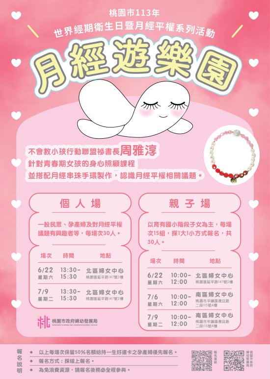 | (二) | 月經遊樂園:自6月22日起至7月9日止共5場次,邀請不會教小孩行動聯盟(不小盟)秘書長周雅淳老師,談青春期女孩的身心照顧課題,以寓教於樂方式談月經議題,運用教具、影片和多元生理用品,引導孩子面對青春期變化,並搭配月經手環串珠DIY製作,在北區及南區婦女中心皆有舉辦,除親子專屬場次,也有開放個人場次,歡迎躍報名參加。 |