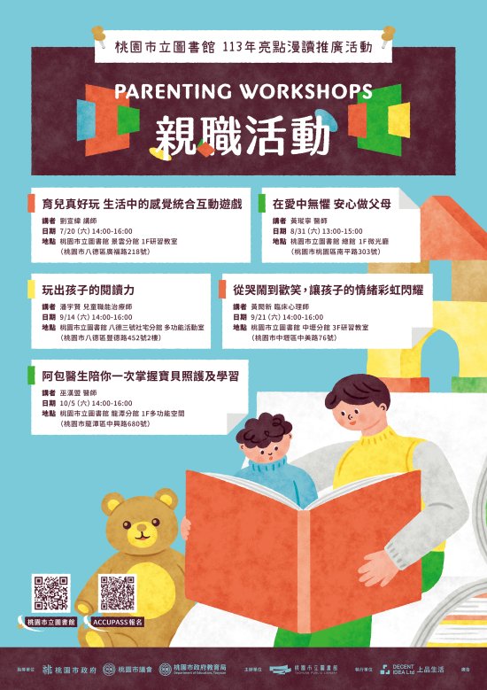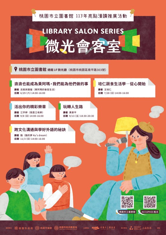 為活絡桃園閱讀城市形象,透過創意亮點行銷閱讀推廣,建立全齡化閱讀風氣,本館於今(113)年6月至11月間辦理一系列講座,邀請市民朋友一起走進閱讀時光,開拓生活視野建立多元價值。