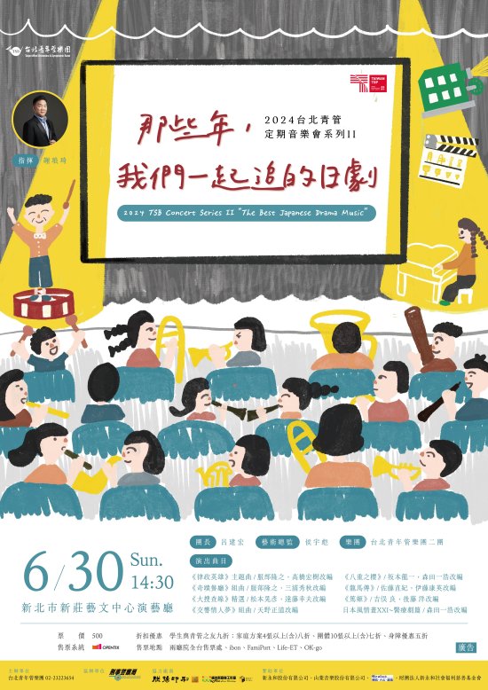 一、2024台北青管定期音樂會系列II,由謝琅琦教授指揮台北青年管樂團二團演出;以日劇配樂為主題,帶來多部耳熟能詳,膾炙人口之經典。橫跨老中青,並挑選日本作曲名家的改編版本,帶您重新回味年少時期追劇的感動。