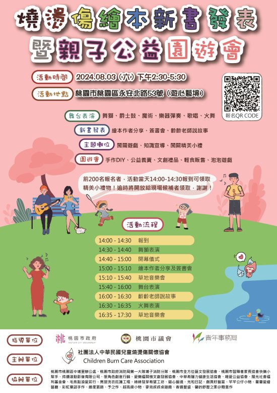 主旨:函轉社團法人中華民國兒童燒燙傷關懷協會訂於113年8月 3日辦理「燒燙傷繪本新書發表暨親子公益園遊會」活 動,請查照。