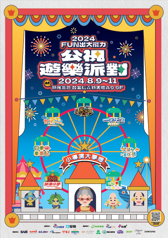一、公視第五屆年度兒童品牌活動【FUN出大能力】公視遊樂派對,集結公視、公視台語台、客家台旗下優質兒童節目,今年更有新開台的生力軍小公視新製節目加入一起共襄盛舉。【FUN出大能力】公視遊樂派對,8月9日(五)-8月11日(日)三天,在「新光三越 台北信義新天地A9 9F」(地址:台北市信義區松壽路9號9F)