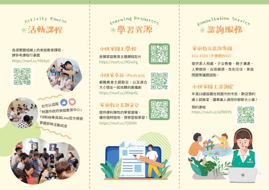 | (一) | 小桃家線上諮詢室:提供年滿18歲以上之桃園市民每月一次之線上諮詢服務,倘有親職教養、家人關係及家庭資源管理議題,歡迎逕至本中心網站申請及預約(預約連結:https://reurl.cc/oZWOY5)。 |