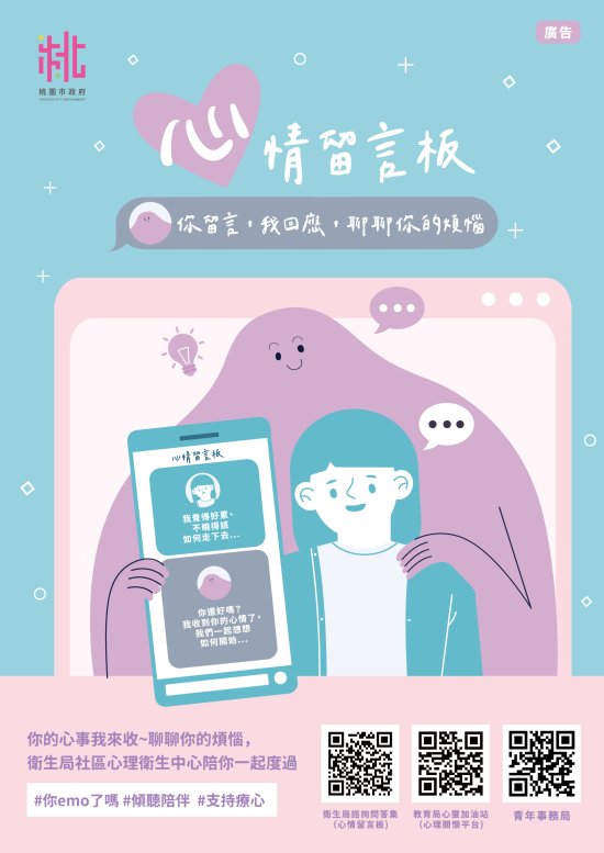 | 三、 | 檢附旨揭海報電子檔(附件1至2),該檔案亦可至本府衛生局社區心理衛生中心網站 (https://mental.tycg.gov.tw/)/諮詢問答集(心情留言板)/海報下載,請轉知所屬推廣運用。 |