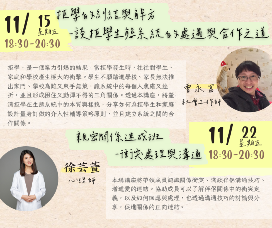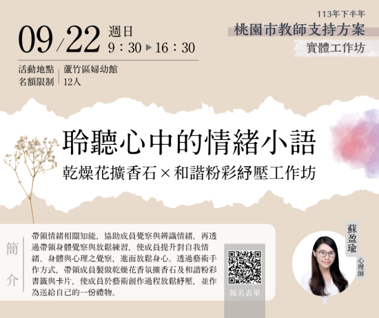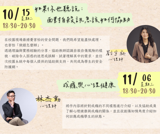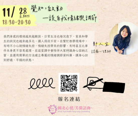 | 二、 | 為增進本市教師全人成長及自我覺察,且有機會紓解工作壓 力以達身心健康之效,國立臺北教育大學(心理諮商暨健康 促進研究中心)自113年9月22日至11月28日止,規劃辦理4場次實體工作坊及5場次教師線上研習課程。倘有需求之教師,可逕至本局教師諮商輔導支持服務網站「最新消息」(https://ttsc.whjhs.tyc.edu.tw/news/)參閱課程資訊,並依課程說明至相應網址完成報名程序。 |