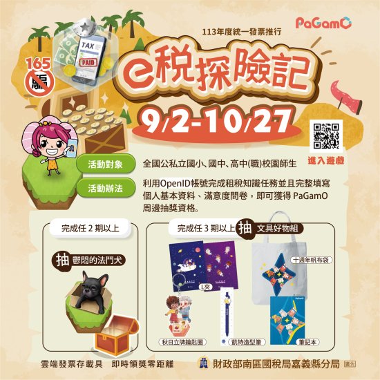 鼓勵校園師生購物消費時使用載具存取雲端發票並知悉重要國稅政策,財政部北區國稅局與PaGomO線上遊戲學習平台共同舉辦「e稅探險記」租稅教育網路活動,檢附活動DM電子檔