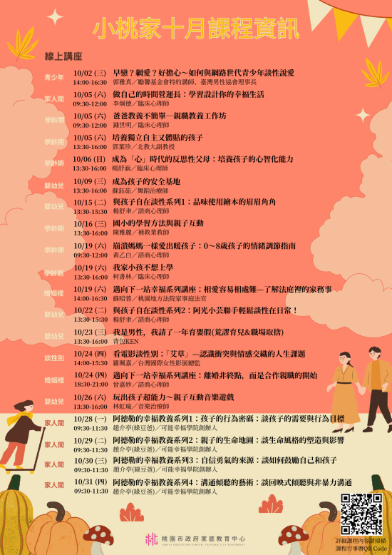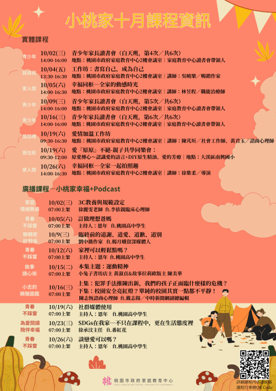 | 主旨: | 檢送家庭教育中心「小桃家10月課程資訊」海報1份,請查照。 |