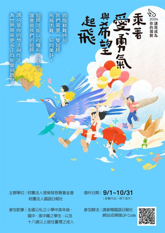 | 三、 | 徵稿活動相關資訊及報名資料下載,請參見「2024讓我成為你的翅膀──乘著愛、勇氣與希望起飛」徵件活動網站(QR Code參見附件);或致電活動小組,電話(02)2392-1133分機1305(請於週一至週五9:30-12:00、14:00-17:00來電)。 |