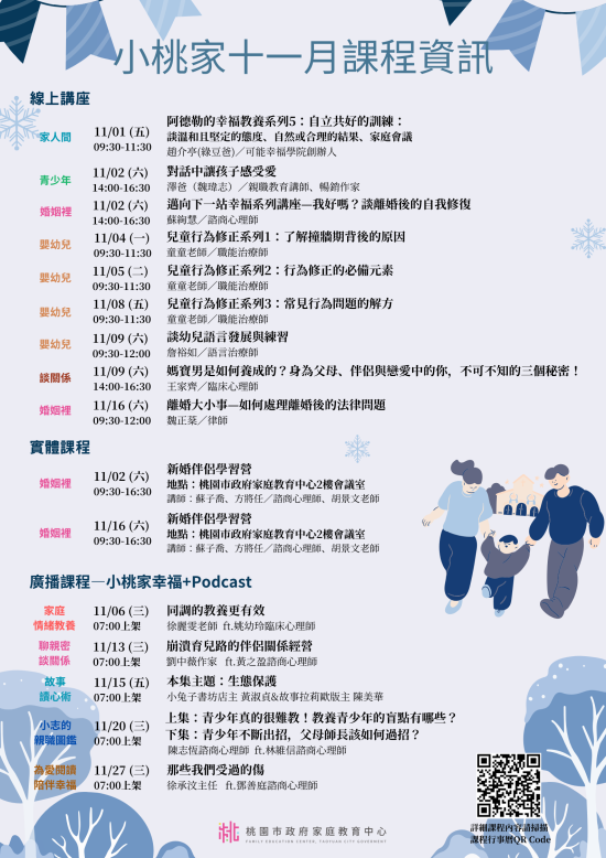 主旨:檢送家庭教育中心「小桃家11月課程資訊」、「青春不踩雷Podcast節目」海報各1份,請查照。