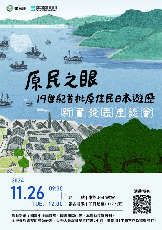 | 二、 | 國立臺灣圖書館為推廣史料近用,將史料轉譯成繪本《原民之眼:19世紀首批原住民日本遊歷》。繪本內容符合十二年國民基本教育課程綱要,適合國小高年級社會課程、國中歷史、高中歷史作為課程延伸閱讀素材。 |