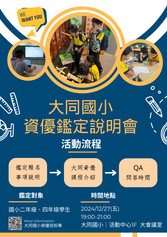 | 三、 | 活動內容: 桃園市114學年度國小資優學生入學前鑑定資訊說明及本校資優班介紹。 |