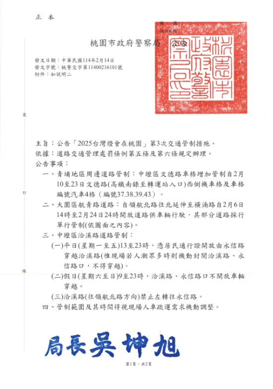 2025台灣燈會在桃園」第3次交通管制公告周知一案