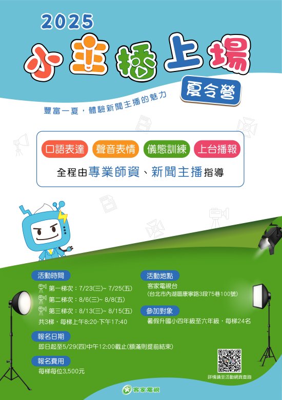 | 一、 | 為增進學童媒體素養、語言表達能力及團隊合作精神,並透過分組學習與實際演練,體驗新聞製作及主播播報技巧,本會客家電視特於暑期舉辦「2025客家電視小主播上場夏令營」,針對暑期後國小四到六年級學生設計內容,並邀請專業講師及新聞主播進行授課。 |
