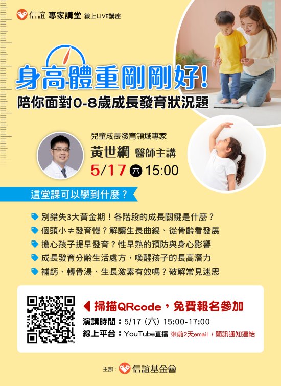 | 一、 | 先養胖,才會抽高?擔心孩子比同齡孩子矮?何時該帶孩子檢查骨齡?成長發育大小事,往往是家長疑惑與焦慮的來源。唯有建立正確觀念、破解迷思,才能提早為不同階段的發育,做好最關鍵的準備。信誼專家講堂將於2025年5月17日(六)下午3:00-5:00舉辦【身高體重剛剛好!陪你面對0-8歲成長發育狀況題】線上LIVE講座,邀請爸媽免費報名參加。 |