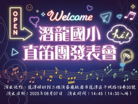 潛龍國小直笛團發表會6月7日(六),歡迎家長帶孩子來欣賞。參加學生可獲得榮譽章一枚!