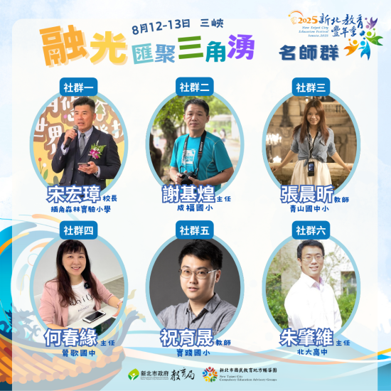 | 1、 | 名師論壇:由6位新北市教育豐年季名師(宋宏璋校長、謝基煌主任、張晨昕老師、何春緣主任、祝育晟老師及朱肇維主任)進行素養教學經驗分享。 |