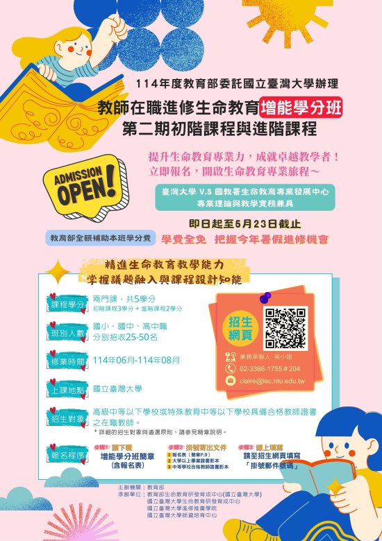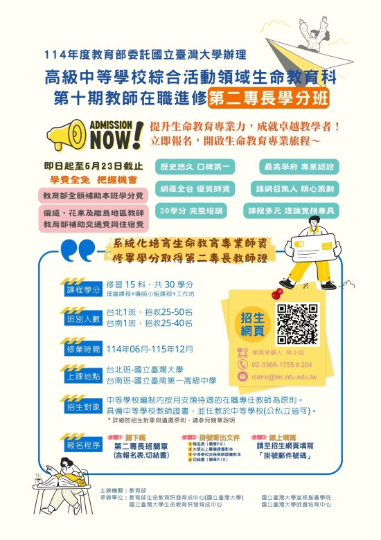 | 二、 | 為落實十二年國民基本教育課綱精神,精進中小學教師生命教育專業知能,教育部委請國立臺灣大學辦理「高級中等學校綜合活動領域生命教育科教師在職進修第二專長學分班」及「教師在職進修生命教育增能學分班」,學分費皆由教育部全額補助。 |