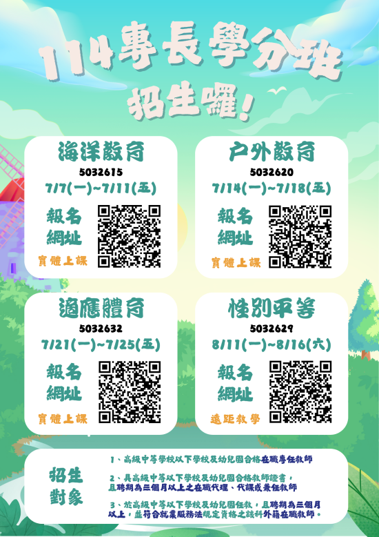 | 二、 | 旨案學分班課程包含「戶外教育」、「海洋教育」、「性別平等」及「適應體育」4班次各2學分,學分費由教育部全額補助。 |