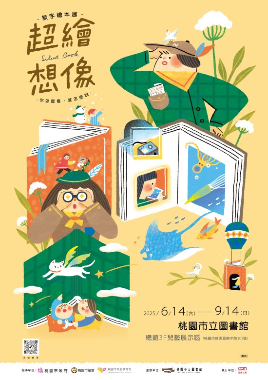 | 一、 | 桃園市立圖書館邀您一同打開圖像閱讀的無限可能,以無字繪本為主題,認識國際知名無字繪本作家及作品,從觀察圖像到創造故事,帶領親子跨越文字的限制,憑藉觀察力與想像力,學會尋找線索了解故事的敘事發展。本活動除展覽外,精彩內容還包含2場繪本講座、3場大型互動演出及23場親子創作體驗。 |