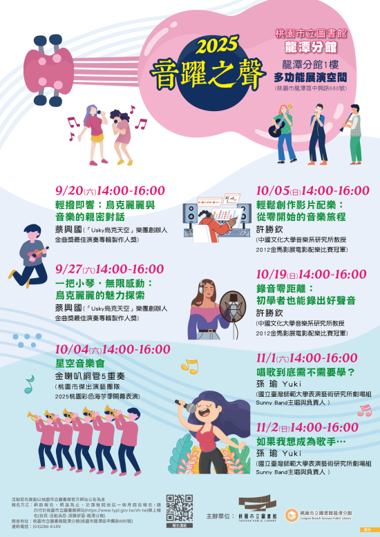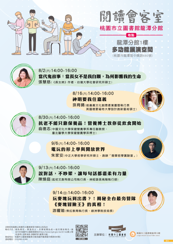 龍潭分館辦理閱讀推廣活動「閱讀會客室」及「音躍之聲」系列講座與課程