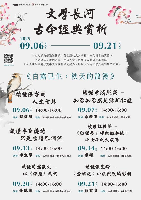 | 一、 | 為推廣文學之美,本館特邀國立中央大學中國文學系學者,共同舉辦「文學長河 古今經典賞析」系列講座。 |