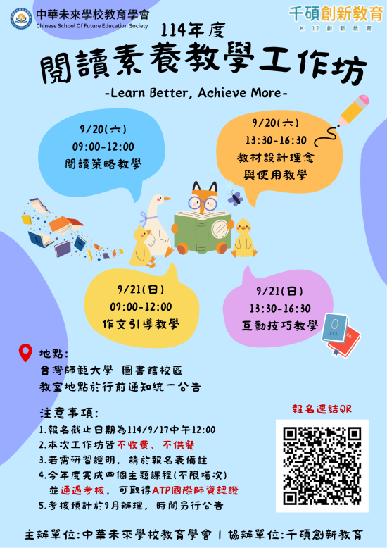 | 一、 | 為提升教師素養導向教學能力,強化閱讀理解教學專業,本會特辦理「ATP素養導向閱讀師資培訓工作坊」。 |
