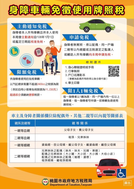 轉知 桃園市政府地方稅務局製作「身障車輛免徵使用牌照稅」宣導海報