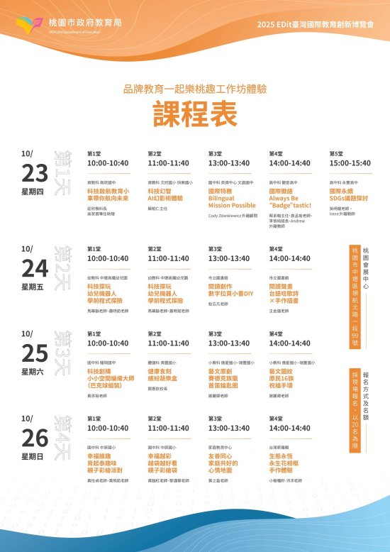| 五、 | 為期4天之活動期間,本局於桃園館規劃「品牌教育一起樂桃趣工作坊體驗」系列課程(以現場報名20名為限),內容結合桃園市教育特色與創新教學實踐,歡迎師生、家長及教育夥伴踴躍參與體驗,深入認識桃園品牌教育的多元樣貌與創新內涵。 |
