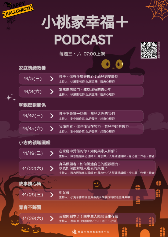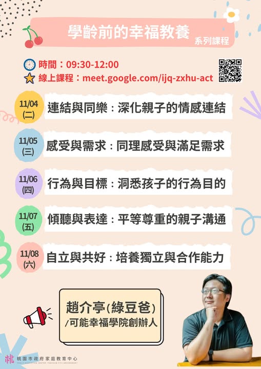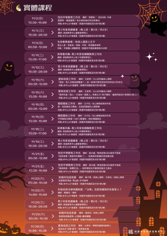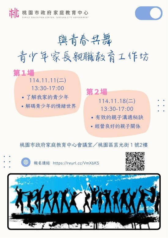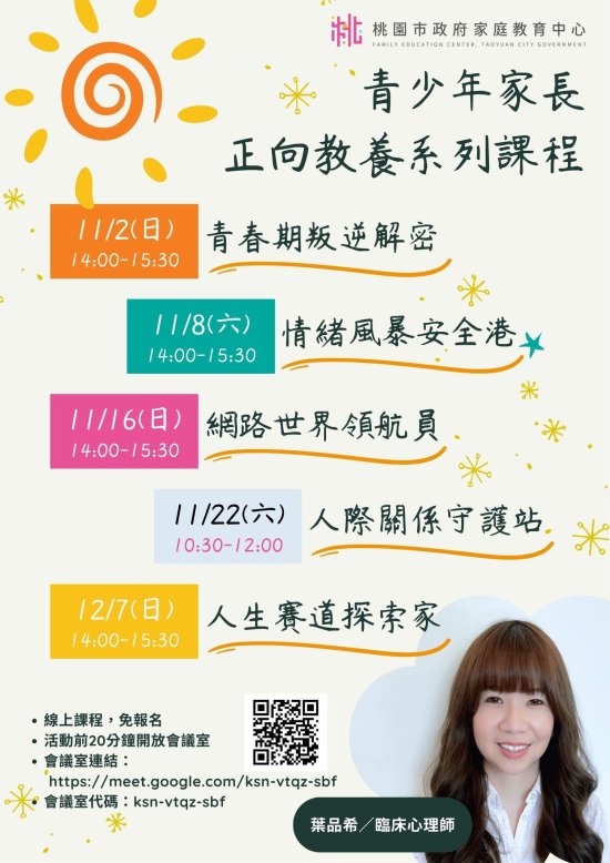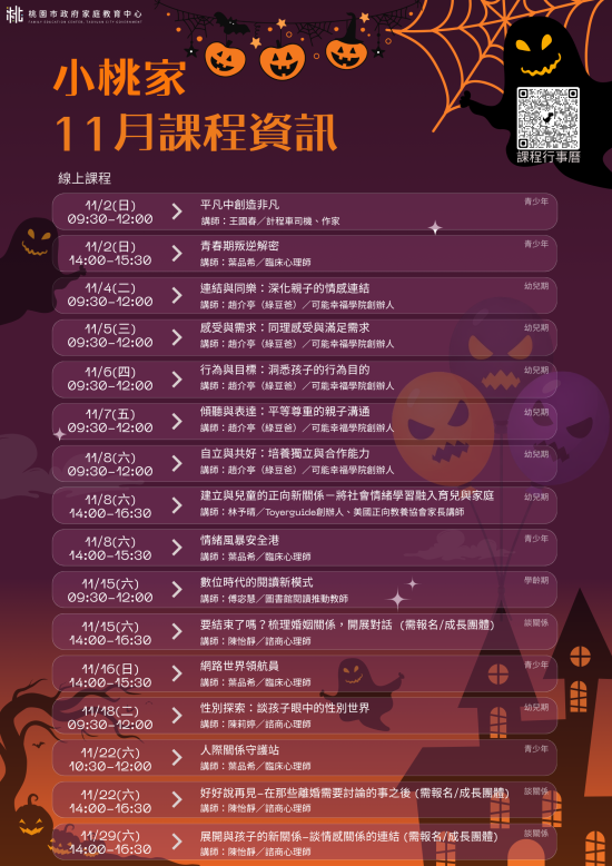主旨:檢送本中心「小桃家11月課程資訊」、「青少年家長正向 教養」、「邁向下一站幸福成長團體」、「學齡前的幸福 教養」、「青少年家長親職教育工作坊」海報1份,請查照。