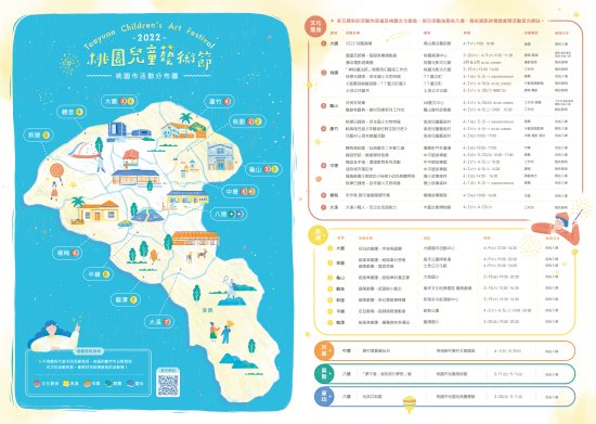 文化局辦理的「2022桃園兒童藝術節」活動期間自3/11~5/8,因有些活動是需要報名的,詳見官網連結、附檔摺頁海報。