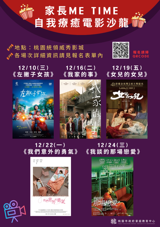 | 主旨: | 檢送家庭教育中心「小桃家12月課程資訊」、「家長Me Time:自我療癒電影沙龍」海報各1份,請查照。 |
