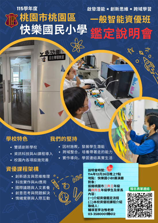 | (三) | 內容:國小資優鑑定報名事項說明、快樂國小一般智能資優班課程介紹。 |