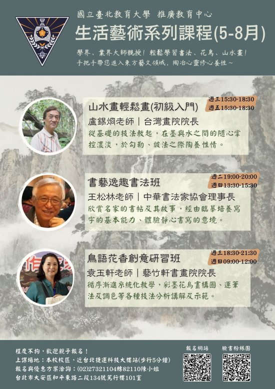| 一、 | 旨揭課程招生對象程度不拘,歡迎對書法、花鳥畫、山水畫有興趣之人士報名參加。報名採線上辦理,課程資訊請至本校推廣教育中心招生頁面查詢(https://cce.ntue.edu.tw/onenews/112)。 |