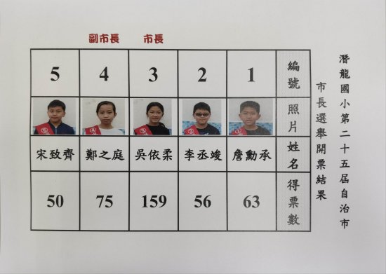 潛龍國小第25屆自治市市長選舉結果:恭賀~五乙吳依柔同學當選為市長,五丁鄭之庭同學當選為副市長。各候選人得票數張貼於學務處走廊。